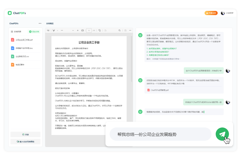 快速分析财务、销售报告、项目提案、培训手册、法律合同等各种文档,让您的工作更轻松